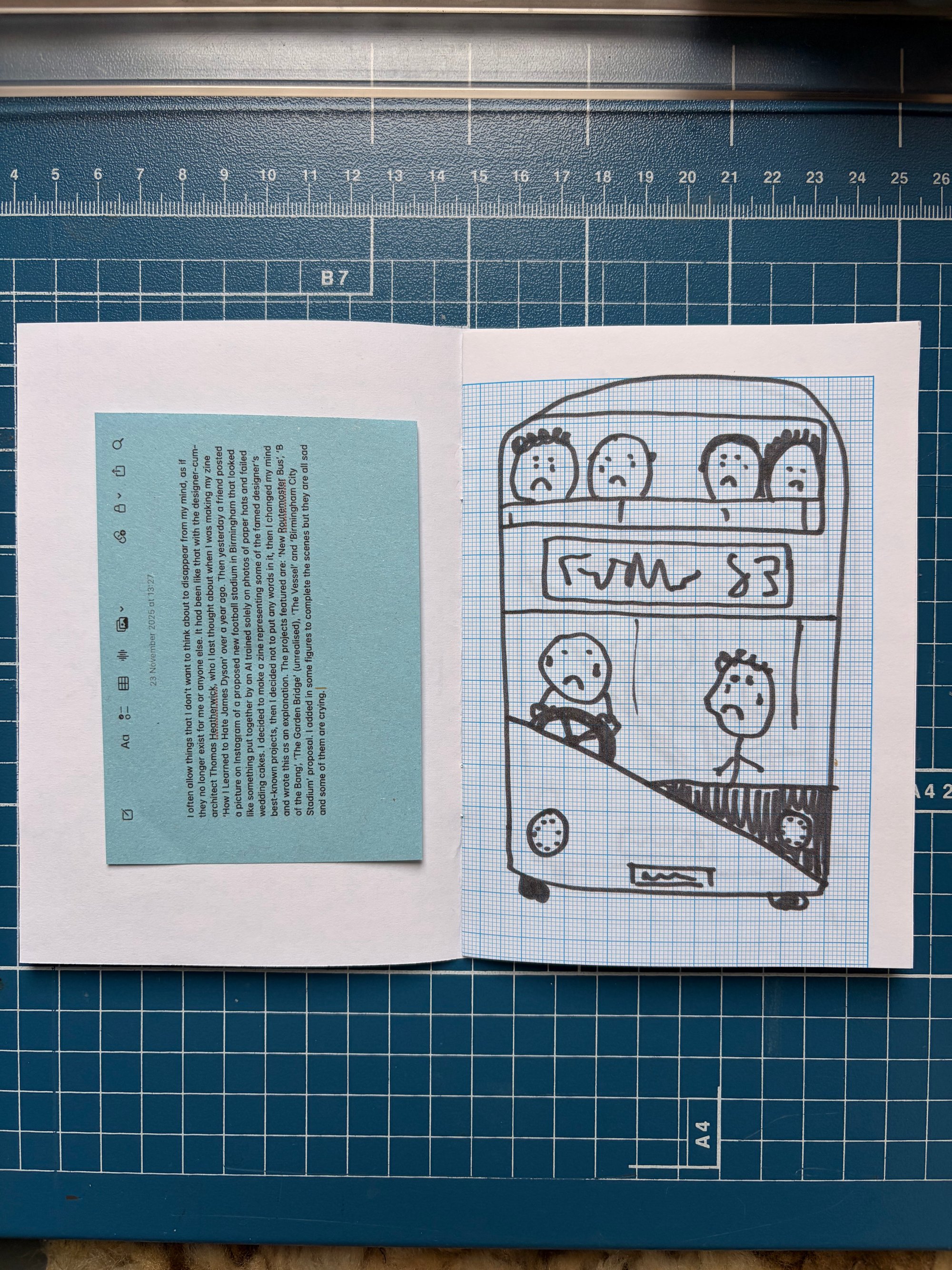 A zine featuring drawings I made very quickly, in marker pen, of projects by Thomas Heatherwick. Printed on graph paper. A6, hand-signed on rear.